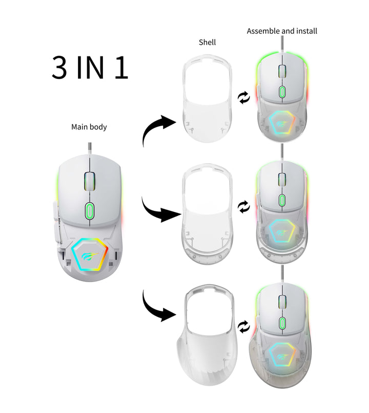 With 3 sizes and a swappable transparent top cover, it fits your hand just right. Enjoy fast and smooth control with 12800 DPI, 7 programmable buttons, and cool RGB lighting. Macro support gives you full control in every game.